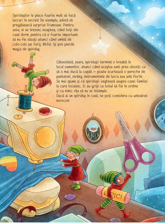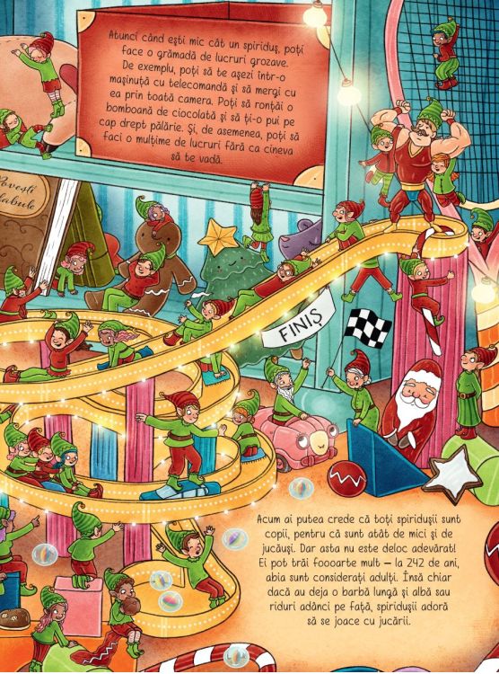 Stiai ca spiridusii au inimile din turta dulce si ca bataile lor de inima suna ca tropotul unor copite, ca sunt foarte puternici pentru ca mananca atat de mult martipan si ca nu uita niciodata o familie pe care au vizitat-o macar o data? Din aceasta carte vei afla totul despre spiridusi: ce se intampla la Marea Competitie de Impachetat Cadouri, de ce se muta ei la oameni in perioada de dinaintea Craciunului, cum isi folosesc magia spiriduseasca si de ce le place atat de mult sa danseze.