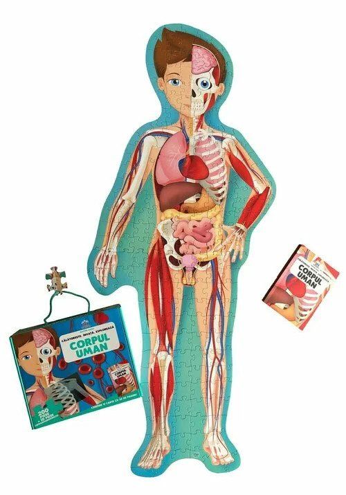 Porneste in fascinanta calatorie de descoperire a corpului uman cu acest set deosebit de la Sassi cu carte si puzzle. Oare cum functioneaza sistemul respirator? Din cel fel de oase este alcatuit scheletul uman? Cum ajunge mancarea sa fie digerata? Cate celule exista in corpul uman? O multime de intrebari la care vei afla raspunsul construind un puzzle supreb de 200 de piese cu imaginea corpului uman si citind cartea plina de informatii interesante inclusa in set.