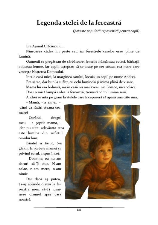 Volumul te poarta prin lumi fermecate, prin intamplari pline de intelepciune si prin obiceiuri care dau identitate sarbatorilor noastre. Vei regasi aici povesti clasice de Craciun, poezii care incalzesc sufletul, cele mai cunoscute colinde romanesti si o adevarata colectie de legende populare despre iarna, fulgi de nea, bradul impodobit, steaua din Ajun, nasterea Mantuitorului si multe altele.