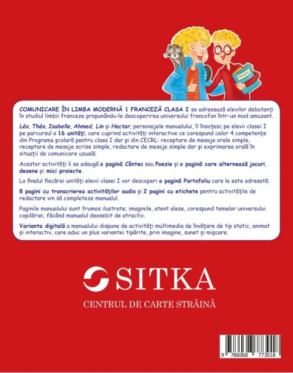 COMUNICARE IN LIMBA MODERNA 1 FRANCEZA CLASA I se adreseaza elevilor debutanti in studiul limbii franceze propunandu-le descoperirea universului francofon intr-un mod amuzant. Léo, Théo, Isabelle, Ahmed, Lin si Hector, personajele manualului, ii insotesc pe elevii clasei I pe parcursul a 16 unitati, care cuprind activitati interactive ce corespund celor 4 competente din Programa scolara pentru clasa I dar si din CECRL: receptare de mesaje orale simple, receptare de mesaje scrise simple, redactare de mesaje simple dar si exprimarea orala in situatii de comunicare uzuala.