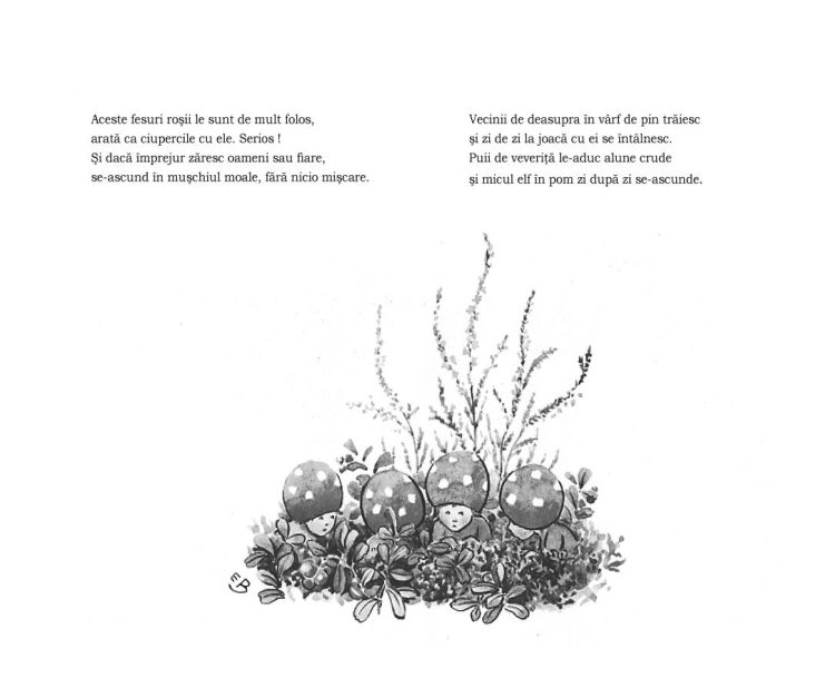 In adancul padurii, sub radacinile unui pin, traieste o familie de elfi. Tatal, mama si patru copilasi veseli, care stiu sa se bucure de darurile naturii, dar si de tovarasia vietuitoarelor si a fapturilor magice pe care le intalnesc. Insoteste-i si tu de-a lungul celor patru anotimpuri: vara, cand alearga liberi, toamna, la scoala si la stransul proviziilor, iarna, la sanius si primavara, cand descopera ca natura se trezeste la o noua viata, intr-o carte care a fascinat cititorii de toate varstele vreme de mai bine de un secol.