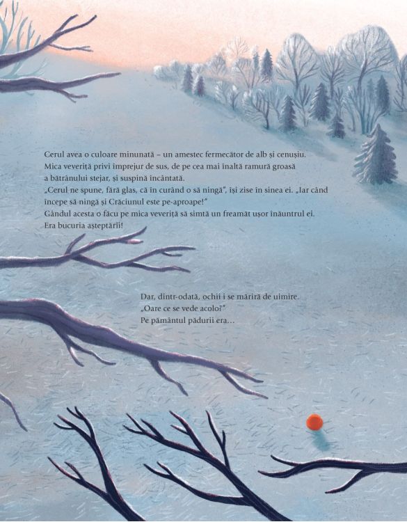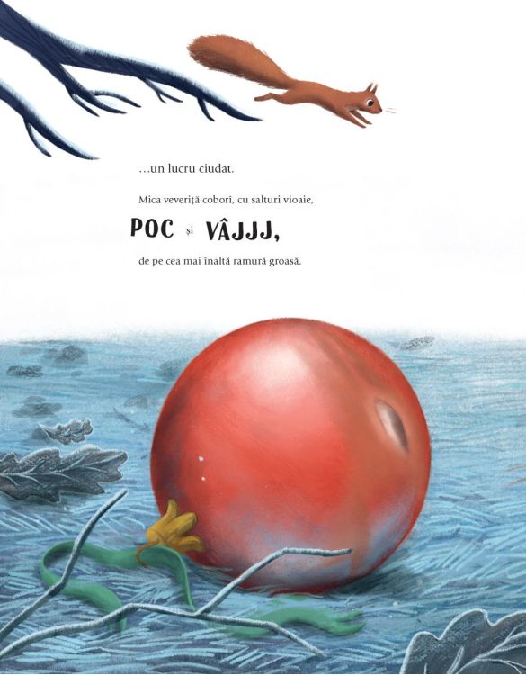 Oare ce straluceste acolo, pe pamantul inghetat al padurii? Este un obiect perfect rotund, de un rosu stralucitor! Mica veverita e nedumerita. Impreuna cu celelalte animale din padure, ea incearca sa afle ce este cu acest lucru misterios, care fara indoiala are legatura cu Craciunul. Si poate ca, datorita micutei bile rosii, vor descoperi ce inseamna cu adevarat aceasta sarbatoare magica…