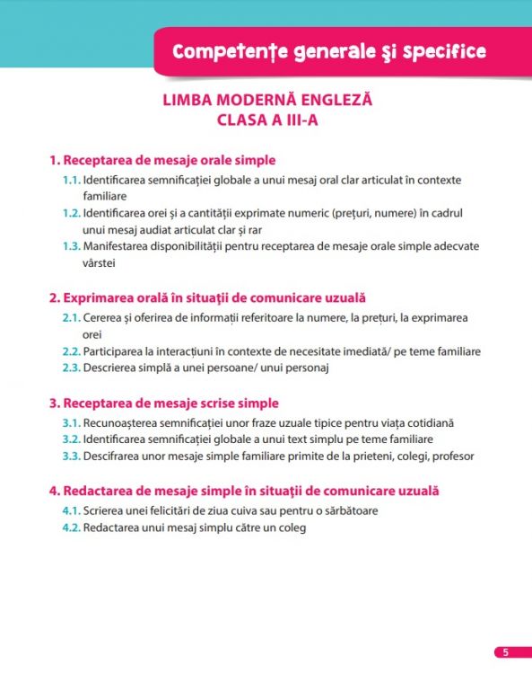 Elevii sunt implicati in activitati multiple de comunicare, receptare de mesaje orale si scrise simple si de redactare mesaje simple in situatii de comunicare uzuala.