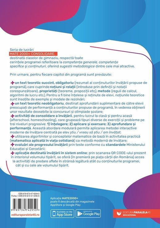 Seria de lucrări MATE 2000+ CONSOLIDARE, destinată claselor de gimnaziu, respectă toate cerințele programei referitoare la competențe generale, competențe specifice și conținuturi, oferind sugestii metodologice dintre cele mai atractive.