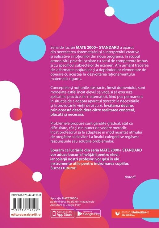 Sperăm că lucrările din seria MATE 2000+ STANDARD vor aduce bucuria învățării pentru elevii cărora se adresează, iar colegii noștri profesori vor găsi în ele instrumente utile pentru îndrumarea copiilor. Succes tuturor!
