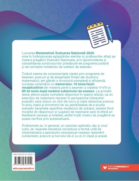 Lucrarea Matematica. Evaluarea Nationala vine in intampinarea asteptarilor elevilor si profesorilor aflati pe traseul pregatirii Evaluarii Nationale, prin aprofundarea si consolidarea continuturilor prevazute de programa scolara si de cerintele modelului de subiect de examen.