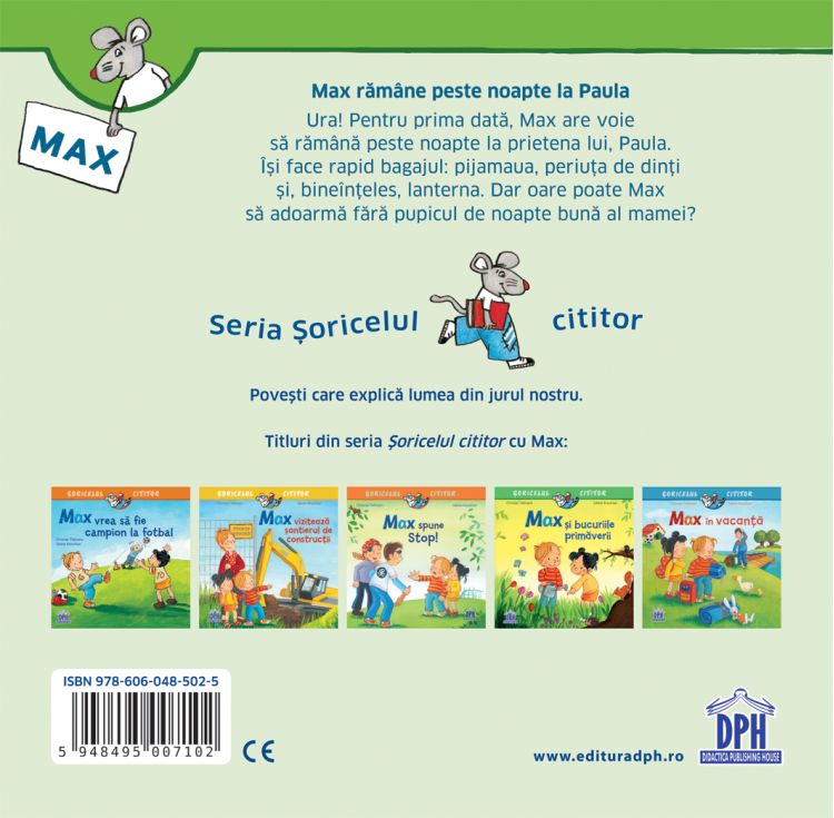 Seria Soricelul cititor cuprinde numeroase povestiri interesante, in special pentru copiii prescolari. Din aceeasi serie: Max merge la scoala, Max merge la doctor, Max invata sa inoate, Max nu merge cu strainii, Max merge la gradinita, Max spune stop!, Max la bunici, Max merge la dentist, Max se bucura de magia Craciunului, Aventuri de iarna cu Max, Max merge la spital, Max viziteaza santierul de constructii, Max ramane peste noapte la Paula.