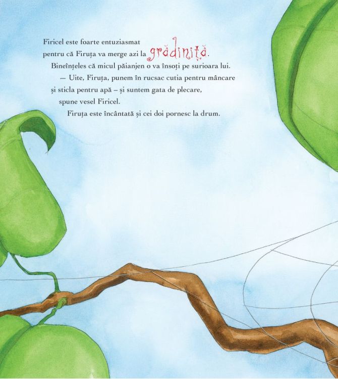 Astazi este o zi plina de emotii – Firuta merge la gradinita! Ce noroc ca micul paianjen Firicel stie foarte bine cum se petrec lucrurile acolo! Asa ca o ia de mana pe surioara lui si ii povesteste tot ce se va intampla la gradinita. Vor canta stand in cerc, vor citi carti interesante, vor lua masa impreuna, se vor costuma pentru petreceri, vor trage un pui de somn la pranz si vor construi in curte un castel de nisip – vor fi atatea activitati si experiente noi pe care le va descoperi!