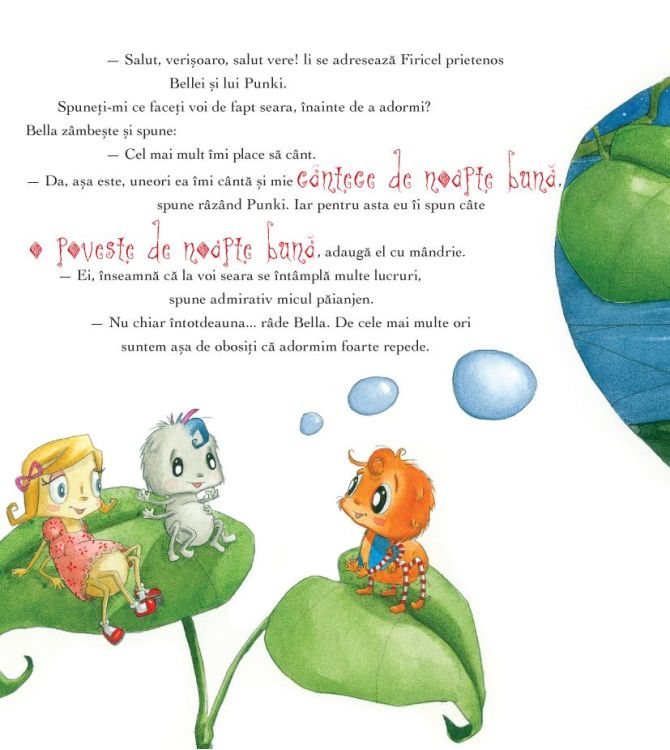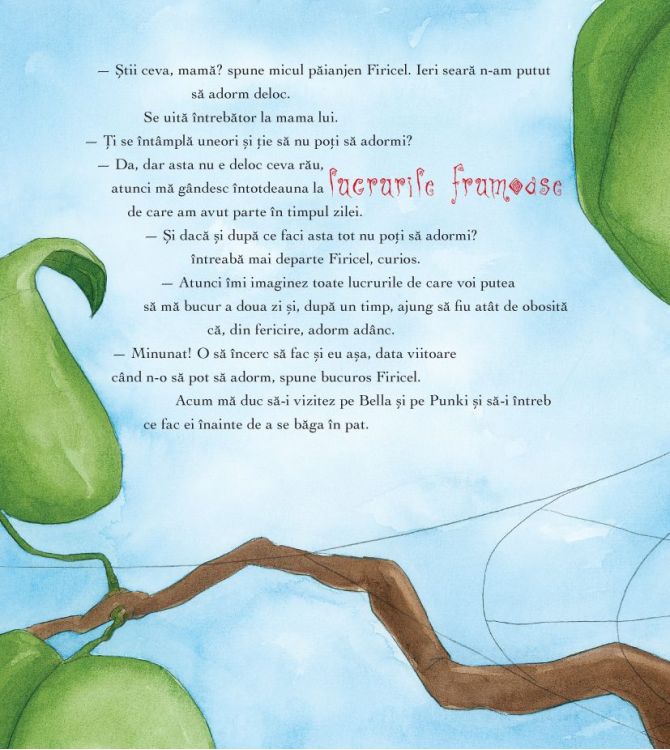 „Ti se intampla si tie uneori sa nu poti sa adormi?” vrea sa afle micul paianjen Firicel de la mama lui. Mama zambeste si ii vorbeste despre micile ritualuri care pot sa te ajute sa adormi. Firicel asculta plin de curiozitate cum procedeaza prietenii lui: Hapciu vorbeste cu animalutul lui de plus, Bellei ii plac cantecele de leagan, iar lui Punki povestile de noapte buna. Dar micul paianjen Firicel? El doreste mai mult decat orice altceva un pupic de noapte buna de la mama sau de la tata! Actrita si autoarea de carti Diana Amft povesteste cu duiosie despre marile si micile ritualuri pentru adormit copiii.