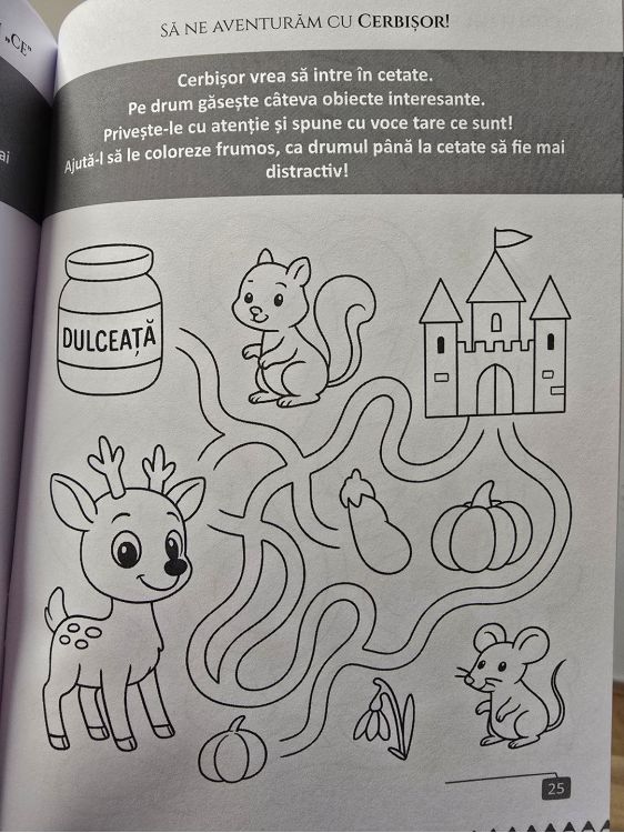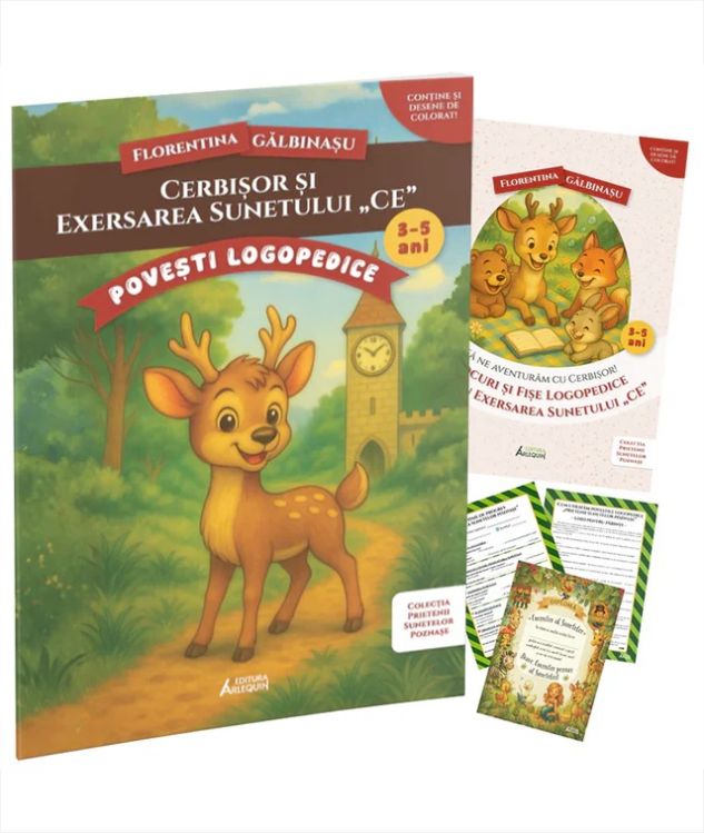 - Caietul „Cerbisor si exersarea sunetului „CE”, in cele 56 de pagini, continua aventura prin labirinturi, potriviri de umbre, imagini de descris si contururi de colorat. Format A5