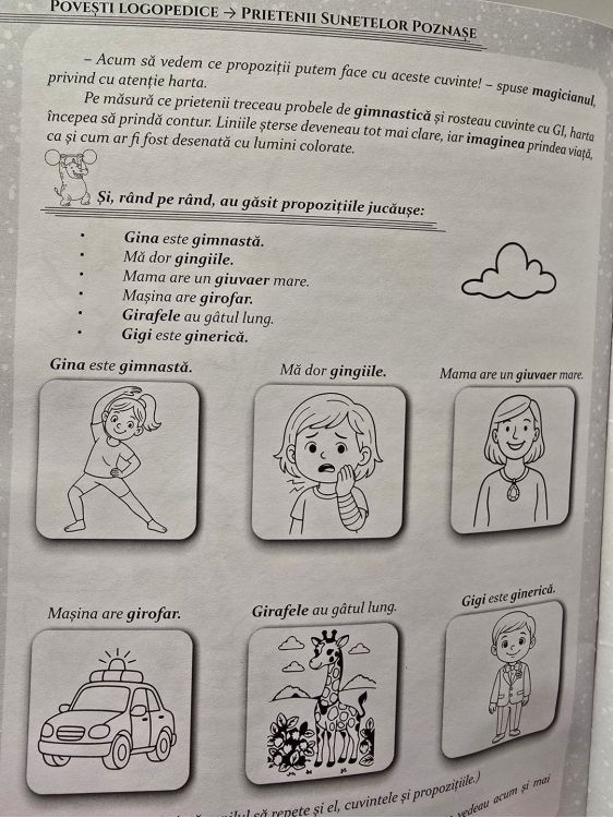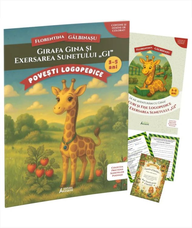 - Poveste logopedica „Girafa Gina si exersarea sunetului GI care introduce sunetul GI prin joaca si imaginatie. Format A4 - 24 pagini
