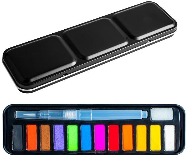 - Pachetul contine o cutie metalica in care sunt depuse pe un suport casetat 12 pastile de acuarele, 1 pensula cu rezervor si 1 burete.