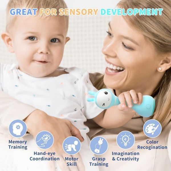 Alilo Smarty Bunny - Iepuras interactiv pentru bebelusi, albastru, este o jucarie versatila si captivanta pentru copii cu varsta intre 0-18 luni. Combinatia sa de divertisment si educatie prin intermediul diverselor functii interactive il face un instrument valoros pentru dezvoltarea timpurie a copiilor. Jucaria atrage atentia printr-un continut variat: rime, povesti, cantece si sunete unice, cum ar fi pocnitul bulelor si mieunatul unei pisici, toate redate printr-un difuzor de calitate. Alilo Smarty Bunny imbunatateste invatarea prin predarea recunoasterii culorilor cu ajutorul urechilor care lumineaza si a cardurilor de culoare incluse. In plus, urechile sale din silicon moale si masticabil, iluminate cu lumini colorate, ofera o experienta sigura si placuta pentru bebelusii care sunt in perioada de dentitie. Proiectat pentru siguranta, jucaria este durabila datorita materialului din plastic ABS, are un design prietenos pentru copii si vine cu o baterie reincarcabila incorporata, fiind un cadou esential, versatil si incantator pentru copiii mici.