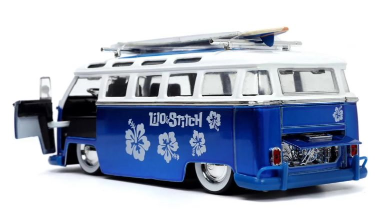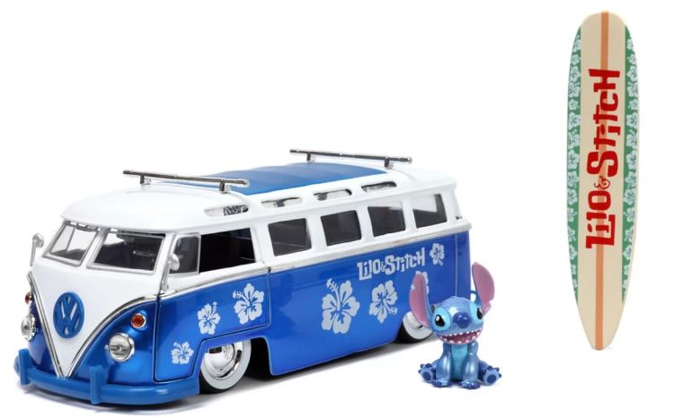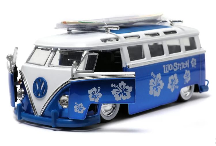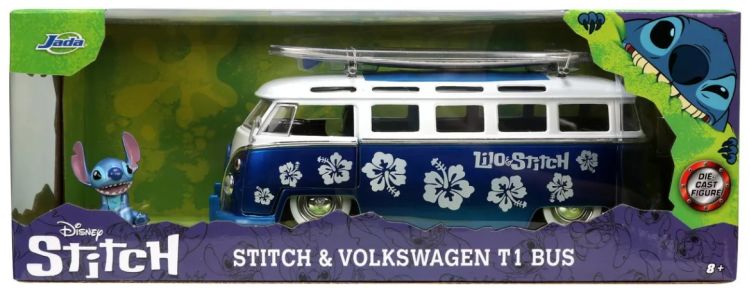 Autobus din metal Volkswagen T1, cu usi mobile si figurina Stitch din metal. Asigurati-va ca niciun Ohana nu este lasat in urma cu Stitch si autobuzul sau Volkswagen T1. Aceast autobuz are o caroserie turnata sub presiune, anvelope din cauciuc, usa care se deschide si compartimentul pentru motor si placa de surf detasabila, cu stil direct inspirat de Lilo & Stitch de la Disney. De asemenea, este inclusa o figurina de colectie Stitch turnata sub presiune de 3. 5 cm.