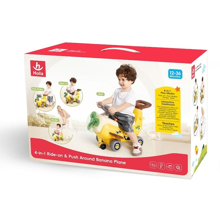 Avionul de jucarie 4-in-1 este conceput pentru copii cu varste intre 12 si 36 luni si ofera patru moduri de joaca ride-on, push walker, stroller si slide. Are un panou interactiv cu volan mobil, elice luminata si sunete, ideal pentru joaca imaginativa. Jucaria contribuie la dezvoltarea abilitatilor motorii grosiere si fine.