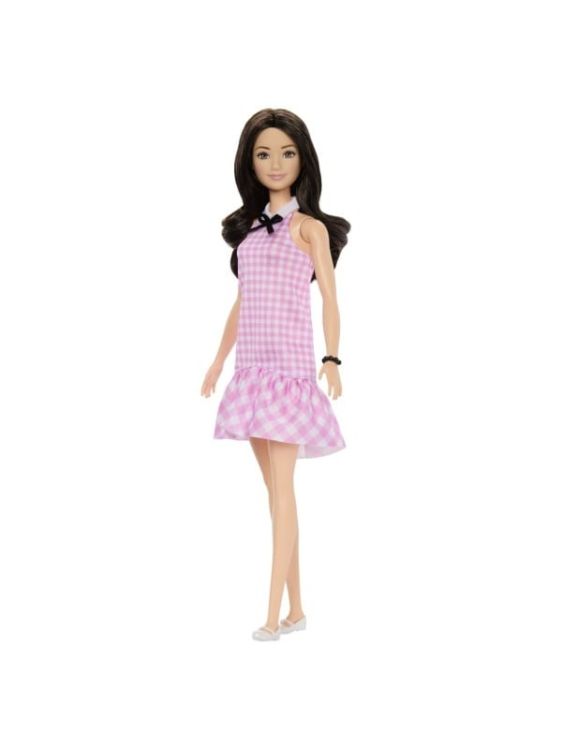 Fashionistas este una dintre cele mai indragite colectii Barbie, oferind o gama larga de papusi cu diferite stiluri si accesorii, introducand conceptul de diversitate si acceptare in randul fetelor. Aceasta colectie include papusi cu diferite tipuri de siluete, tonuri de piele, culori de ochi si par, astfel fetele nu se vor plictisi niciodata si isi vor gasi papusa asemanatoare stilului lor. Papusile au stilul lor propriu, inspirat de ultimele tendinte din moda si vin cu o tinuta completa, incaltaminte si accesorii fabuloase. Hainutele sunt confectionate astfel incat se pot potrivi oricarei papusi din gama Fashionistas. Descopera fiecare papusa Barbie din colectia Barbie Fashionistas si exploreaza lumea minunata a modei! Aceasta papusa Barbie din gama Fashionistas are parul brunet, desprins. Sandalele albe cu toc mic complementeaza perfect aspectul sau. Rochia ei roz cu alb ii scoate in evidenta personalitatea si adauga un plus de eleganta tinutei ei.
