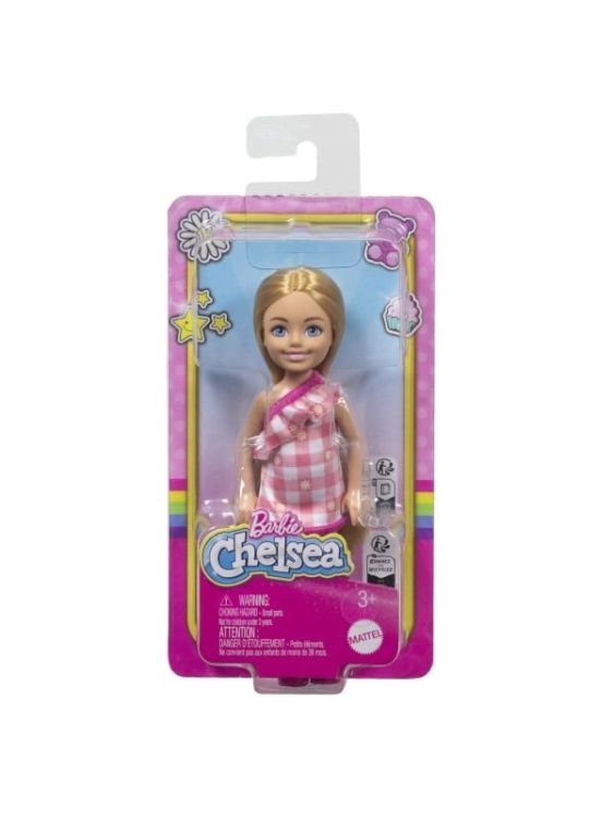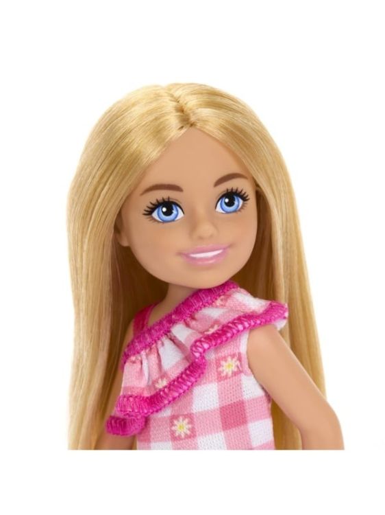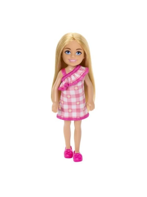 Papusile Barbie Chelsea vin cu pantofi si piese vestimentare detasabile. Creeaza povesti nenumarate cu scenarii diferite impreuna cu papusile Chelsea. Pentru scenarii creative achizitioneaza toate papusile Chelsea. Aceasta papusa se remarca prin farmecul ei si este imbracata intr-o frumoasa rochie roz cu carouri si imprimeu inflorat care o face sa straluceasca. Parul blond al papusii Chelsea este coafat lung si drept, iar papucii roz completeaza perfect look-ul sau fermecator.