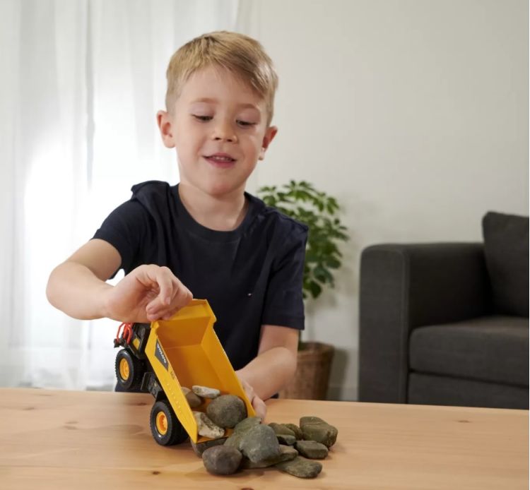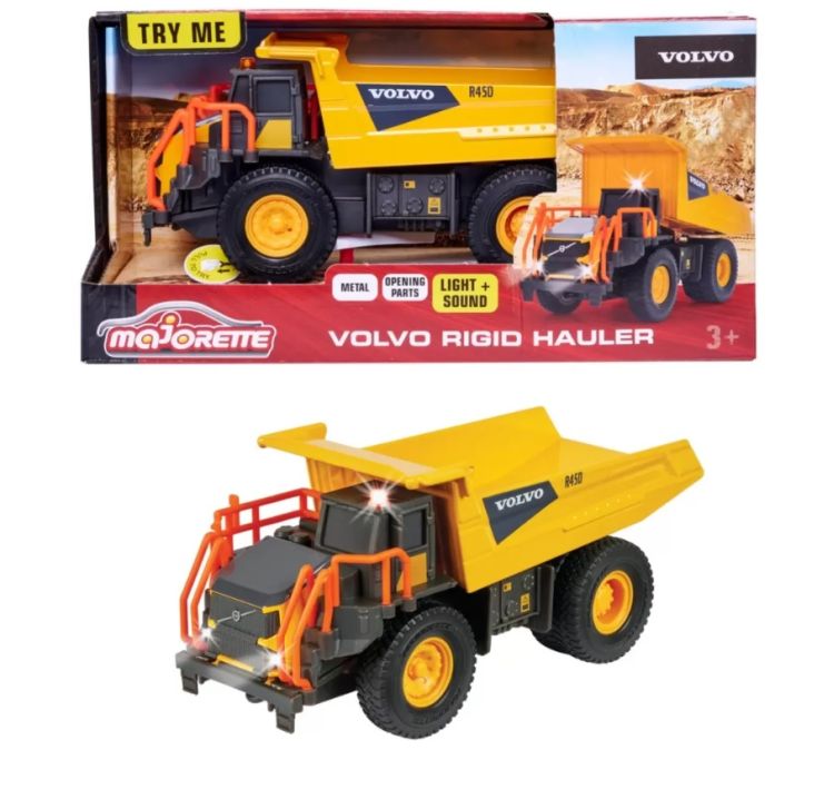 Volvo Rigid Hauler (20 cm), Basculanta (galben/portocaliu) cu anvelope din cauciuc, efecte luminoase si sonore, vehicule de constructii, masina de jucarie premium pentru copii de la 3 ani si peste. Pe langa un design complex, acest basculant Majorette vine cu numeroase functii practice care sunt garantate pentru a distra copiii mici, inclusiv doua efecte sonore si lumini diferite si o capota care poate fi ridicata pentru a dezvalui motorul detaliat. Patul de descarcare poate fi, de asemenea, mutat in sus si in jos pentru incarcare si descarcare. Atat capota, cat si patul de descarcare sunt realizate din metal. Celelalte parti sunt fabricate din plastic.