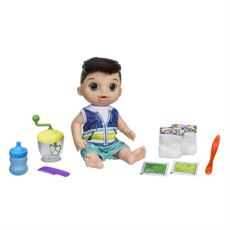 Bebe Lingurita varianta baietel este o papusa care bea si mananca, apoi face pipi si caca. Acest bebelus ne aduce in lumea papusilor hranite cu mancarica praf si ofera copiilor o noua modalitate distractiva de pregatire a hranei! Cand vine ora mesei, adauga pachetul de mancare si putina apa in blender. Copiii pot sa intoarca manerul pentru a amesteca mancarea bebelusului! Dupa ce hranesti bebelusul cu lingurita, da-i biberonul - cand isi face nevoile, poti sa-i schimbi scutecelul. Include: papusa cu haine care se pot scoate, blender, lingurita, biberon, doua pachete de mancarica praf, 2 scutece si un pieptan. Ambalata in cutie cu platforma, cu fereastra transparenta pentru vizibilitate.