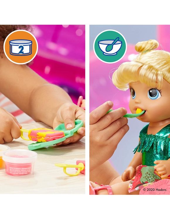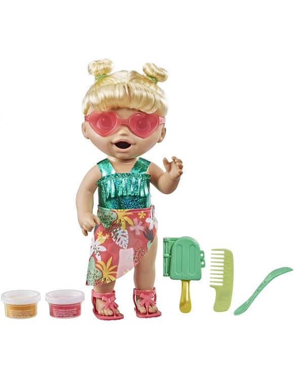 Este prima papusa Baby Alive care prezinta atat hranire, cat si jocuri de apa! Cu mancarea solida reutilizabila pentru papusi si gheata, copiii pot crea forme de inghetata pentru a hrani papusa Baby Alive Sunshine Snacks!