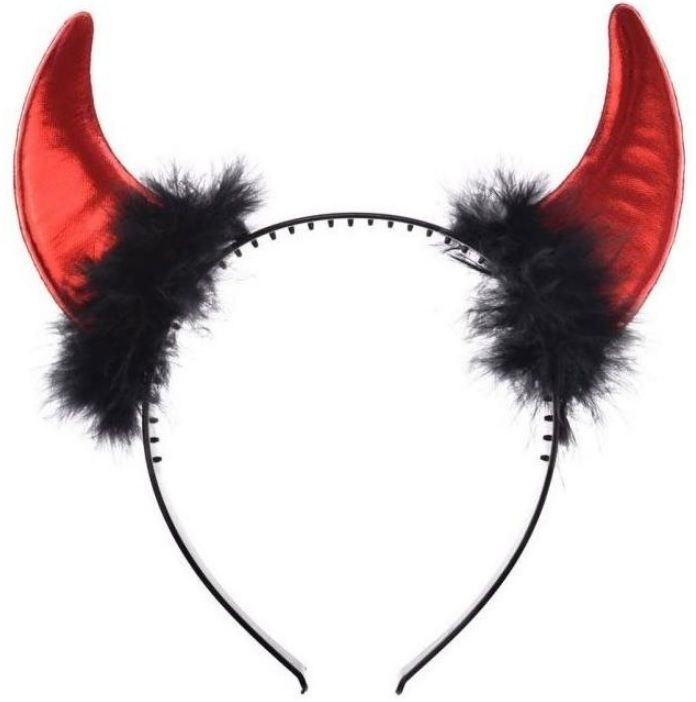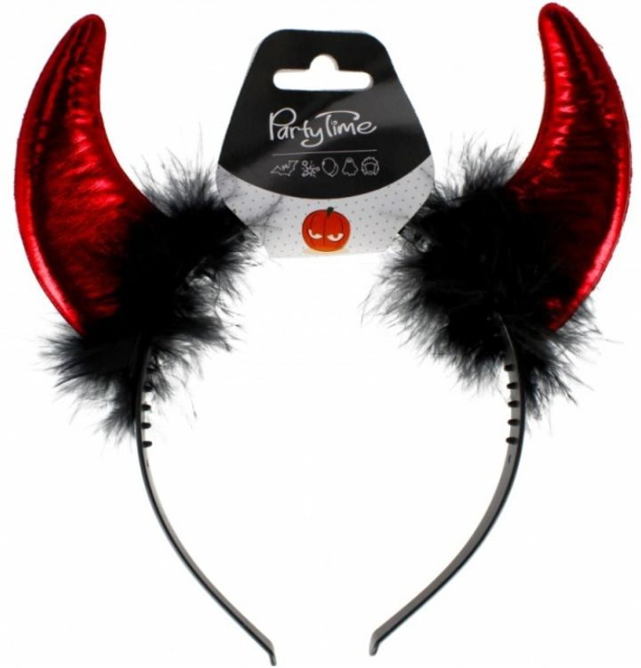 Coarne rosii, stralucitoare, din material metalic, montate pe o bentita. Un finisaj decorativ cu pene negre delicate a fost adaugat acolo unde cornul se conecteaza la bentita. Parte dintr-un costum de Halloween, bal de carnaval sau un gadget de sine statator. Dimensiunea benzii este de 21 cm.