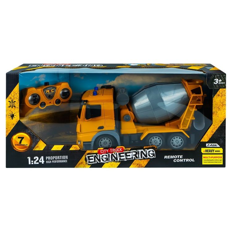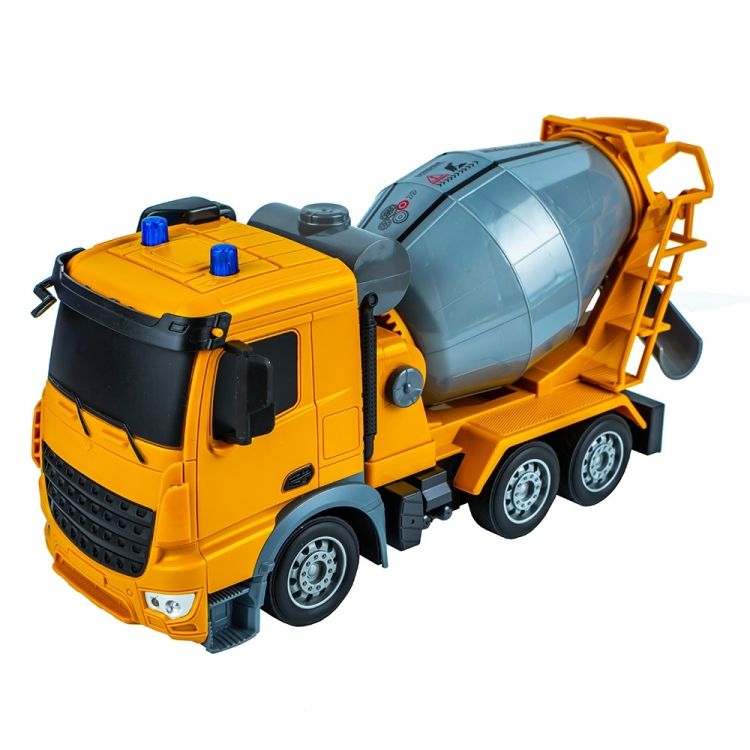 - Camionul, replica la scara 1: 24 a unui camion real, este echipat cu o lopata detasabila, tambur rotativ, jgheab de evacuare mobil, 6 roti cu suprafata din cauciuc si oglinzi din cauciuc. Acesta, cu ajutorul radiocomenzii, se deplaseaza inainte si inapoi prin actionarea rotilor din spate, vireaza la stanga si la dreapta prin rasucirea rotilor din fata, are cuva rotativa in ambele sensuri. Deplasarea inainte este insotita de aprinderea farurilor frontale, iar rotirea cuvei este acompaniata de aprinderea luminilor de semnalizare de pe plafonul cabinei. Cei mici au posibilitatea de a se bucura de toate aceste functii prin apasarea butonului demonstrativ.