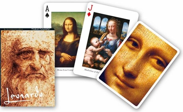 Cartile de joc de colectie de la Piatnik, care infatiseaza cele mai cunoscute opere ale lui Leonardo, pot constitui un cadou frumos pentru oricine iubeste arta.