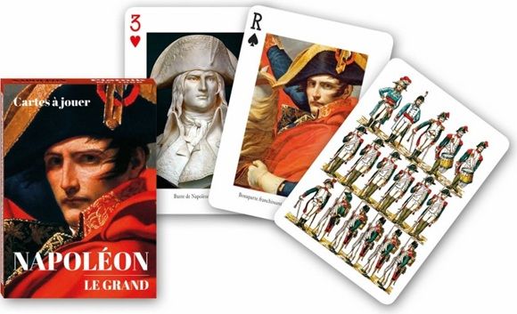Pachet cu 55 de carti de joc de colectie (52 de carti de joc + 2 jokeri + o carte descriptiva), fiecare carte de joc avand ca background cate o pictura, sculptura, gravura, toate avand ca tema personalitatea lui Napoleon Bonaparte, precum si marile sale succese militare.
