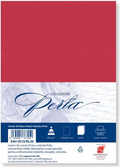 Carton special colorat A4 Colorarte Perla, 250g/mp, rosu perlat, top 50 coli