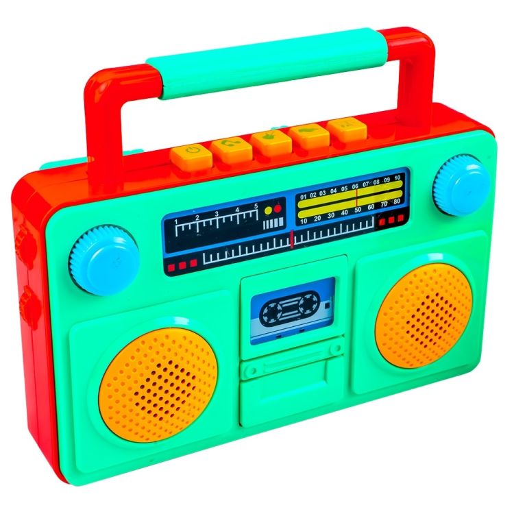 - Aspectul retro sic, cu forma dreptunghiulara si maner, precum si culorile intense vor atrage atentia copiilor. Jucaria cu imprimeu cu afisaj cu frecvente si leduri luminoase, butoane si rotite decorative si imprimeu imitativ pe fereastra casetei are antena.