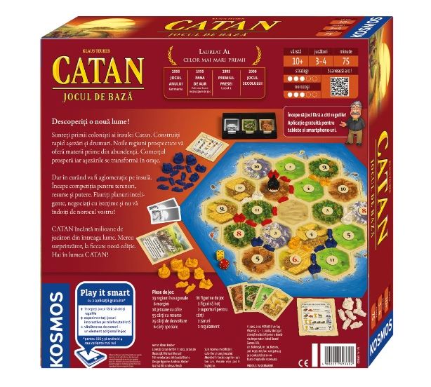 CATAN este numita insula pe care tu si prietenii tai ati descoperit-o. Sunteti primii locuitori. Sunt construite asezari, apoi drumuri. Materiile prime (resursele) ajung de la sate la orase prin intermediul comertului. Uneori exista lut din abundenta, alteori minereu. Schimburile de resurse deschid noi posibilitati pentru tine si pentru ceilalti colonisti. In curand va fi aglomeratie pe insula - competitia pentru terenuri, materii prime si putere incepe. In final este clar - va ramane doar un conducator al insulei CATAN.