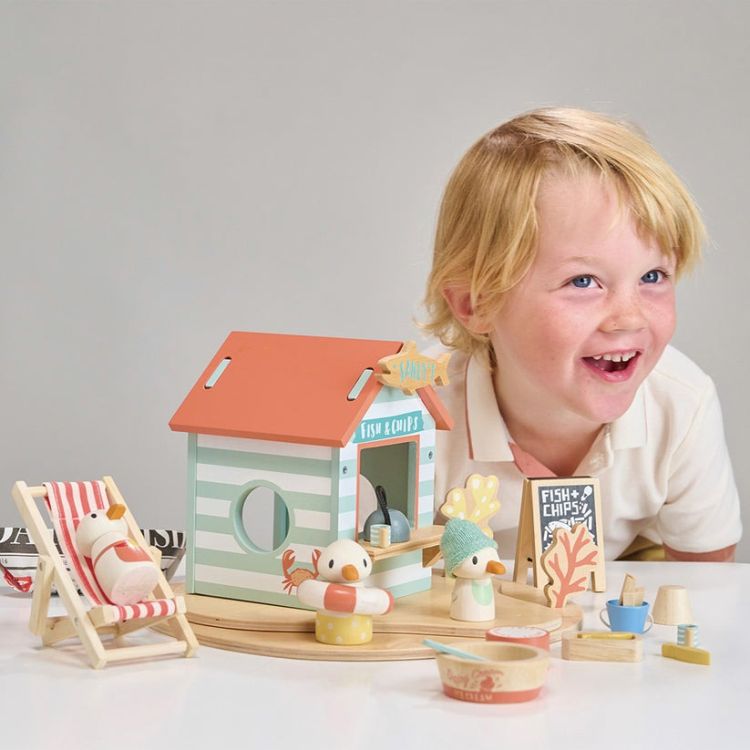 Faceti cunostinta cu Sandy, pescarusul din lemn, si familia ei, care locuiesc pe plaja si au transformat o mica coliba intr-un stand de peste cu cartofi prajiti. Setul este construit pe 2 baze din lemn care imita nisipul si include: doua bucati de alge marine, un sezlong, un ceainic, o cupa de inghetata cu lingurita din lemn, trei pesti intr-un vas, o galeata cu cartofi prajiti, un semn „Fish & Chips”, un castel de nisip, o acadea si o barcuta din ziar. Tatal pescarus, Gully, poarta o caciulita tricotata si are un colac din lemn detasabil. Numele pescarusilor sunt scrise pe partea inferioara, astfel incat aceste personaje simpatice sa poata deveni parte dintr-o aventura pe malul marii, plina de povesti.