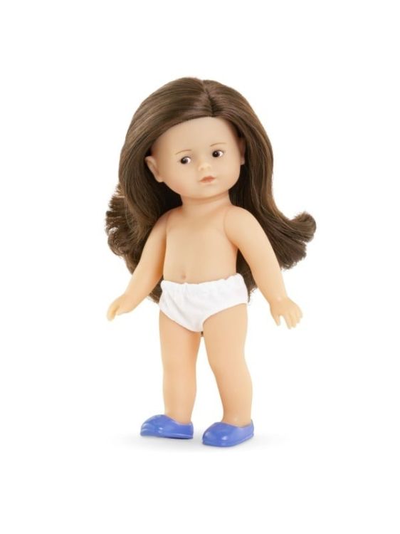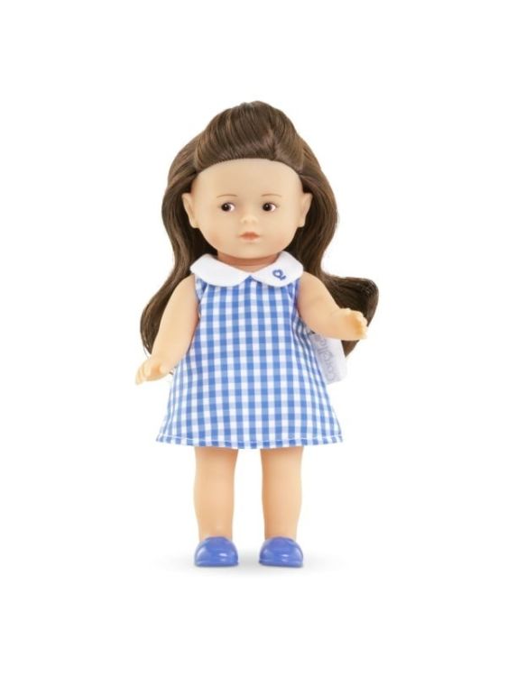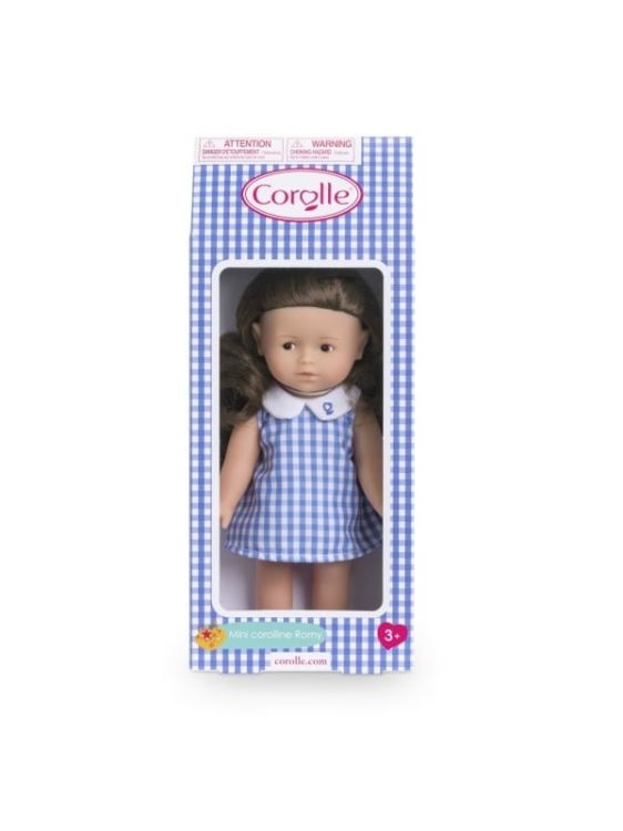 Mini Corolline Romy este o papusa mica, cu pielea deschisa la culoare, de 20 cm, &bdquogata de oferit cadou&rdquo. Are un corp moale la atingere, complet din vinil, cu un parfum delicat de vanilie. Ochii ei caprui sunt pictati pe fata, iar parul lung, matasos si saten este ideal pentru coafare usoara. Vine imbracata intr-o rochie in carouri si o pereche de pantofi mulati asortati.