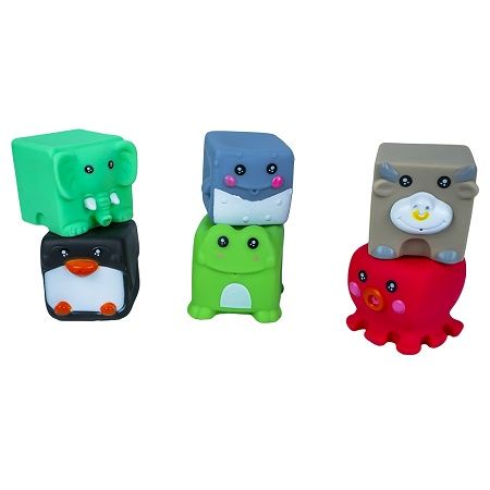 - Mod de utilizare: cuburile pot sa pluteasca pe apa, pot fi aruncate si prinse, si de asemenea pot fi stivuite sau animalutele scot sunete suieratoare atunci cand sunt stranse in mana de catre copilasi, distrandu-i pe cei mici. Cuburie pot fi utilizate si pentru jocul in cada. Inmuiati blocurile in apa pentru a le umple, apoi strangeti-le pentru a stropi.