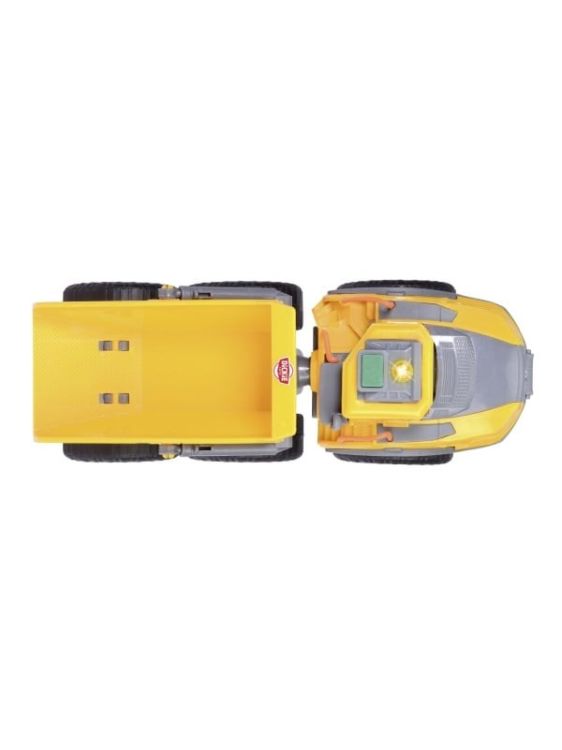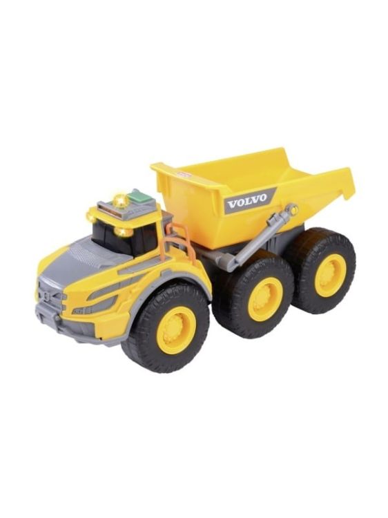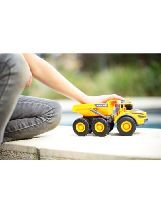 Basculanta Volvo - vehicul de constructie mare de 23 cm cu functie de basculare, sunet, lumina, roata libera, vehicule de santier pentru copii de la 3 ani si peste. Fara autobasculanta, nimic nu functioneaza pe santierul mare din camera copiilor sau in gradina! Un adevarat must-have pentru micii constructori. Axa articulata din spatele cabinei soferului asigura distractie deosebit de agila si numeroase oportunitati de a lucra pe santier. Luminile stralucitoare ale tacklerului se aprind la atingerea unui buton si datorita efectelor sonore integrate, experienta de joc devine deosebit de reala.