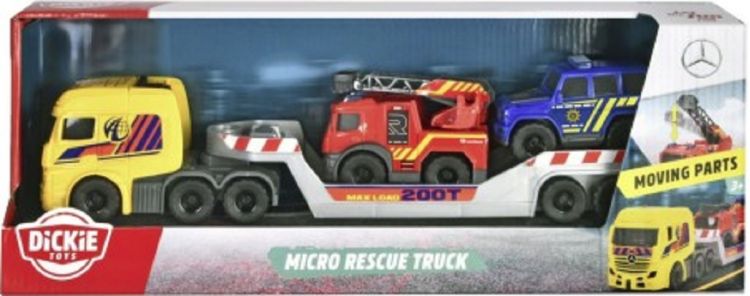 Micro Camion de salvare 3 in 1 (32 cm) - Camion Daimler cu remorca si 2 masini de jucarie Mercedes-Benz (masina de politie si motor de pompieri), masina de jucarie pentru copii de la 3 ani si peste. Set de masini 3 in 1 detaliat pentru copii cu varsta de 3 ani si peste &bdquoCamionul de salvare&rdquo lung de 32 cm duce politia si pompierii la fata locului cu viteza fulgerului. Exista o masina de pompieri Mercedes-Benz Antos si o masina de politie Mercedes-Benz G-Class in spatele camionului Mercedes-Benz Actros - toate cele 3 au licenta oficiala. Camionul de pompieri are o scara mobila, in timp ce coada remorcii se pliaza pentru a permite masinilor de jucarie sa urce si sa coboare cu usurinta.