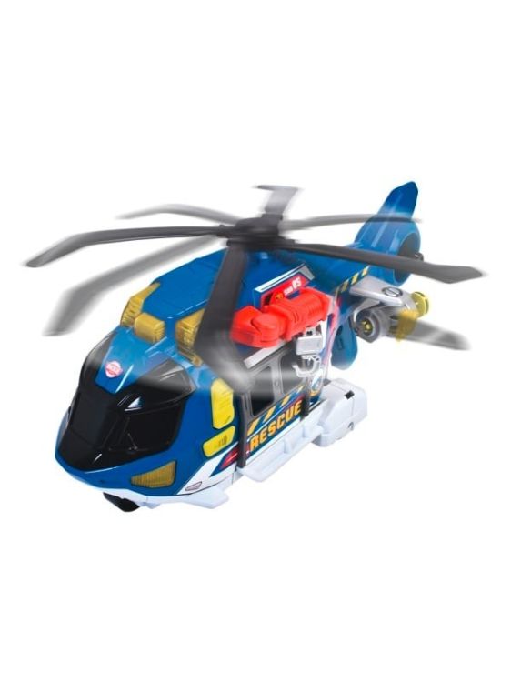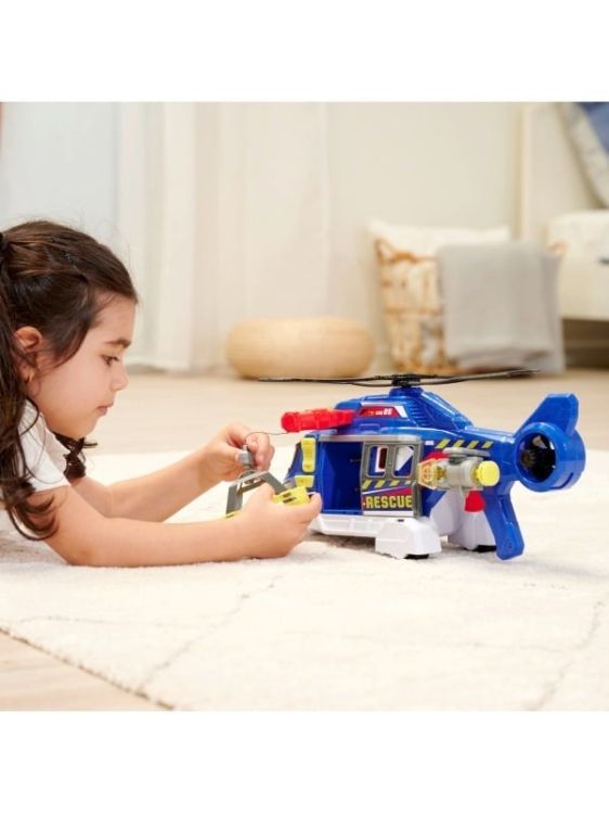 Dickie Toys Elicopter de jucarie mare pentru copii cu varsta de 3 ani si peste (39 cm) Elicopter de salvare cu troliu cu cablu, accesorii, efecte luminoase si sonore (include baterii). Acest elicopter de jucarie de la Dickie Toys este plin de functii distractive, inclusiv o elice rotativa, roti mobile si un troliu cu cablu pentru coborarea targii. Elicopterul este echipat cu o elice mecanica, care poate fi actionata prin intermediul unui buton amplasat pe maner. Dispune de un brat de macara pliabil cu troliu motorizat pentru ridicarea si coborarea carligului sau a targii, precum si de un tun lateral cu functie de tragere. Elicopterul reda sunete realiste, inclusiv sunete radio si sirena, insotite de efecte luminoase. Setul include baterii, o targa si 2 proiectile.