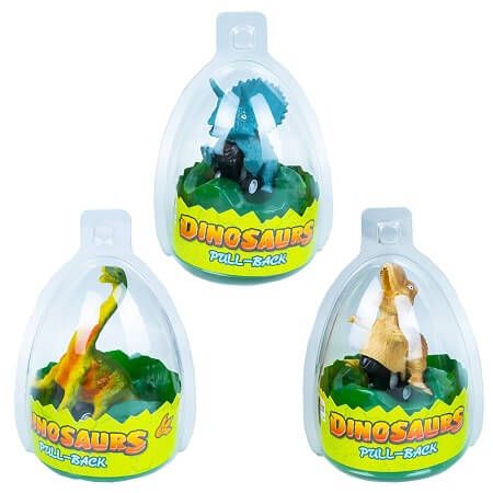 Set de 12 dinozauri diferiti ca forma si culoare, in ou de plastic, cu roti actionate prin sistemul pull-back, incurajeaza imaginatia.