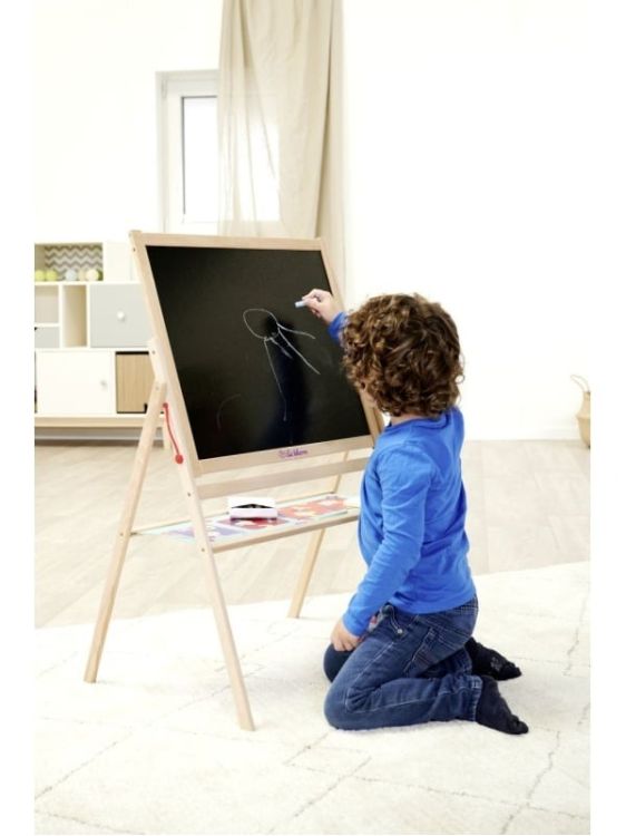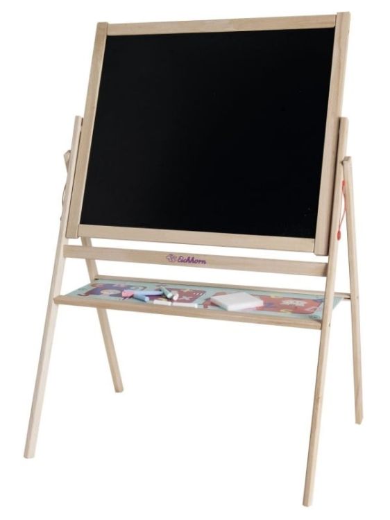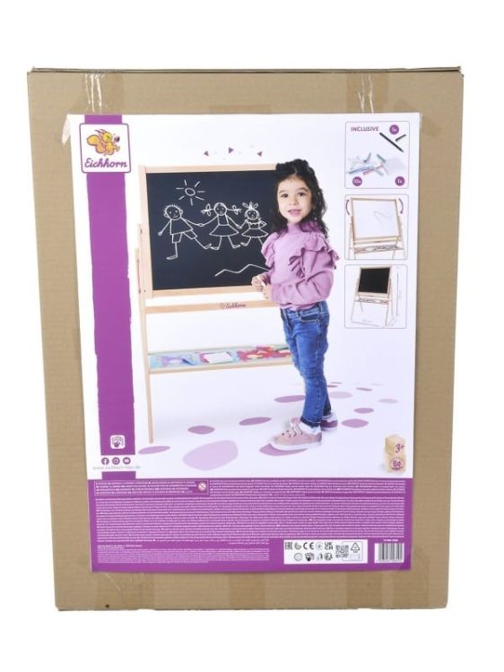 Tabla de desen Eichhorn Cu tabla de desen cu doua fete de la Eichhorn, imaginatia artistica a celor mici nu are limite. Jocul si pictura promoveaza creativitatea si abilitatile motorii ale copiilor. Tabla de desen este fabricata din lemn de fag de inalta calitate, masoara 58 x 86 cm si include 10 creioane colorate, un pix si un burete. O parte este pentru pix, iar cealalta pentru creioane. Desenele cu creta si pix pot fi spalate, permitand revopsirea sau rescrierea tablei iar si iar. Tava de depozitare este perfecta pentru depozitarea ustensilelor de scris. Potrivita pentru copiii cu varsta de 3 ani si peste.