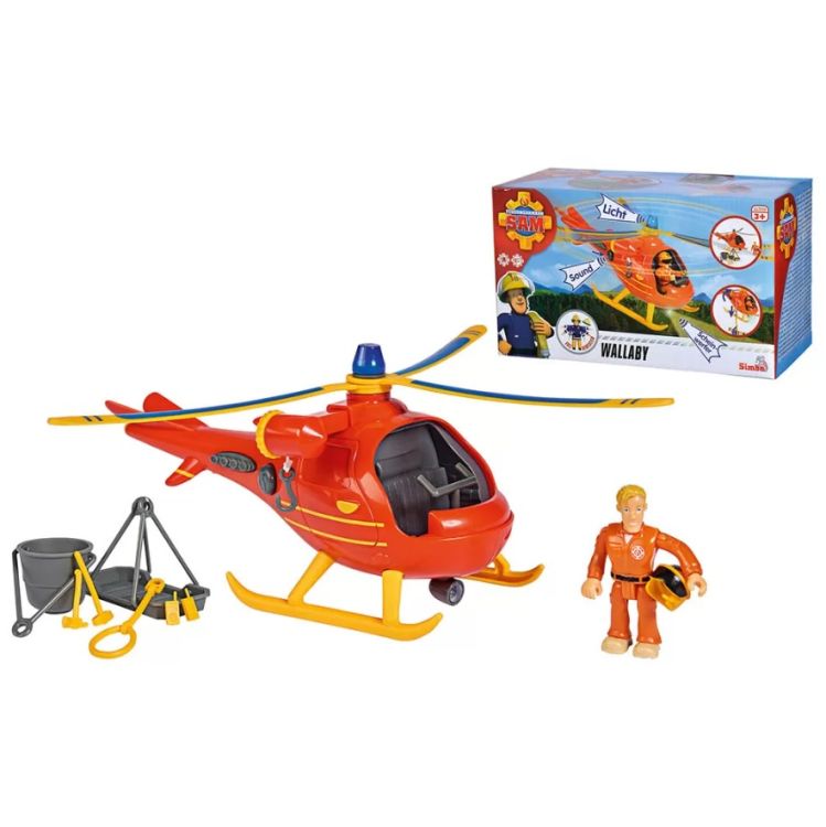 Wallaby, elicopterul de interventie al pompierului Sam. Jucaria este dotata cu efecte luminoase si sonore. Sunt incluse si accesorii precum targa si figurina.