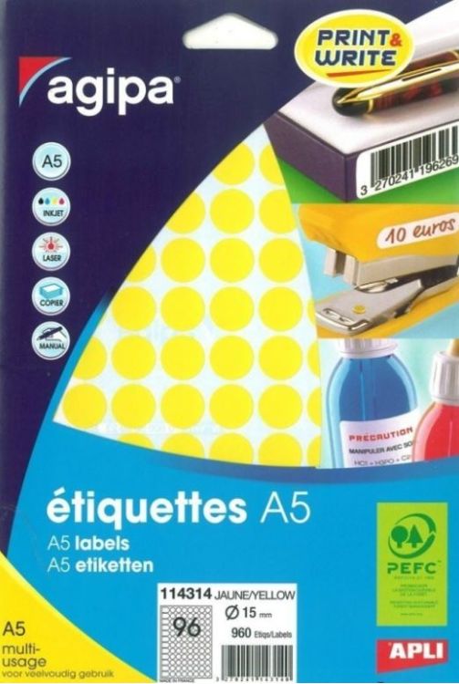 Etichete autocolante Agipa 114314, 96/A5, 15mm, permanente, rotund, galben, top 10 coli (960 etichete)