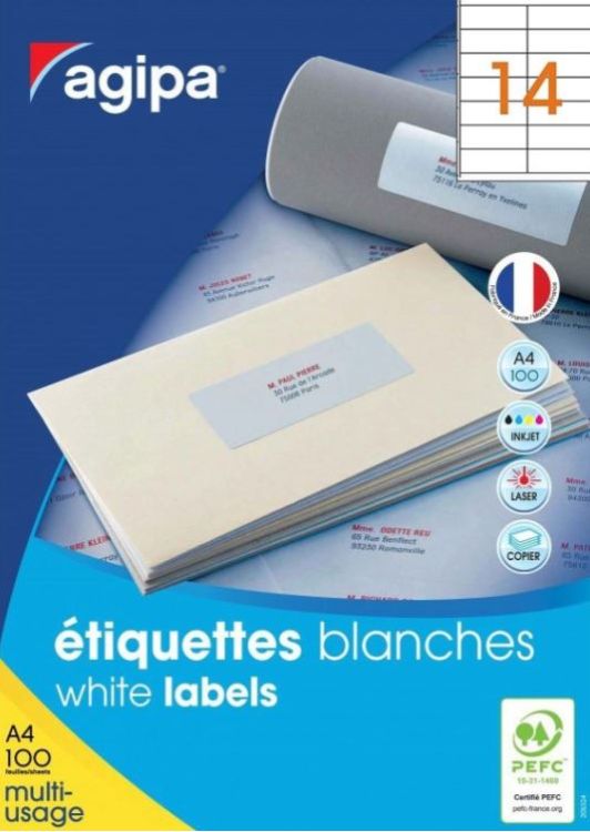-Etichete autocolante Agipa 119008, 14/A4, 105x42mm, permanente, colturi drepte, alb, top 100 coli (1400 etichete)