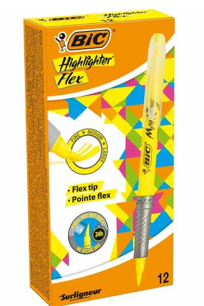 BIC realizeaza o gama larga de instrumente de scris inca din 1950. Identificati cu precizie si formatati toate ideile principale cu aceste markere evidentiatoare BIC Highlighter Flex. Cutia contine 12 evidentiatoare cu cerneala galbena cu uscare rapida, care nu va trece prin hartie. Au un varf flexibil, tip pensula, ce permite o subliniere sau evidentiere controlata (1 - 4. 3 mm). Evidentiatorul BIC Highlighter Grip Flex este realizat cu tehnologie anti-uscare de ultima ora, putand sta fara capac pana la 24 ore. Caietele, manualele, documentele sau hartiile dvs. nu au aratat niciodata atat de organizate si de vesele.