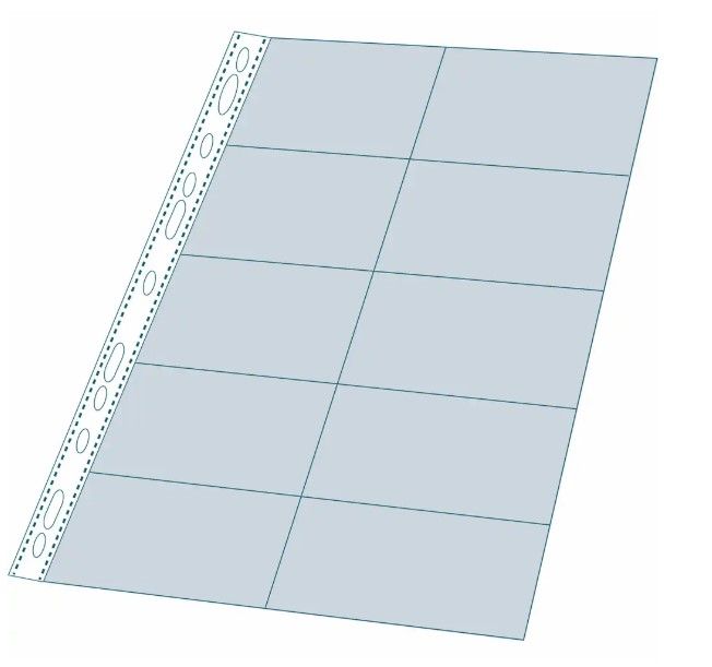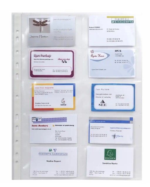 File de protectie realizate din polipropilena, utilizate pentru protejarea si sistematizarea cartilor de vizita. Prevazute cu deschidere in partea laterala si 11 perforatii standard pentru indosariere. Format: A4. Capacitate: 20 carti de vizita, fata-verso. Grosime: 110 microni. Unitate de vanzare 10 bucati/set.