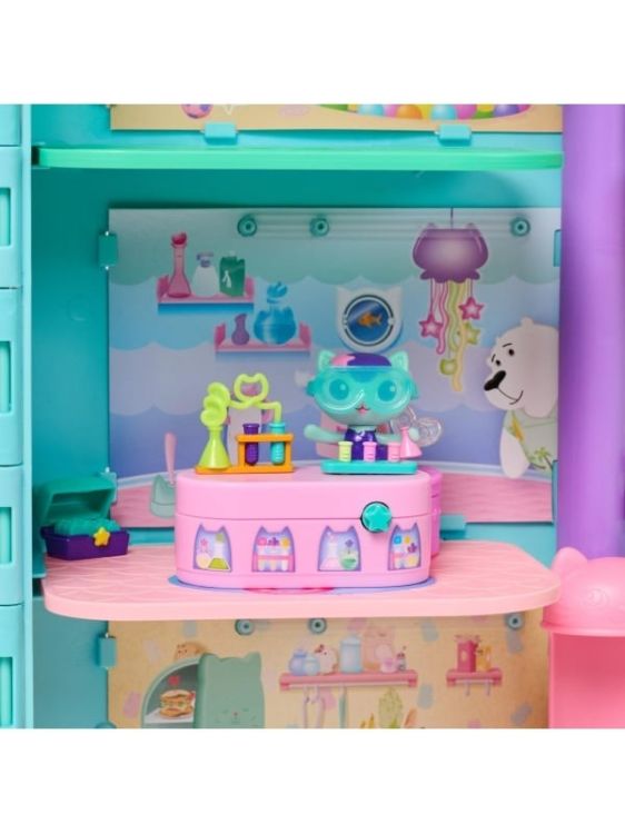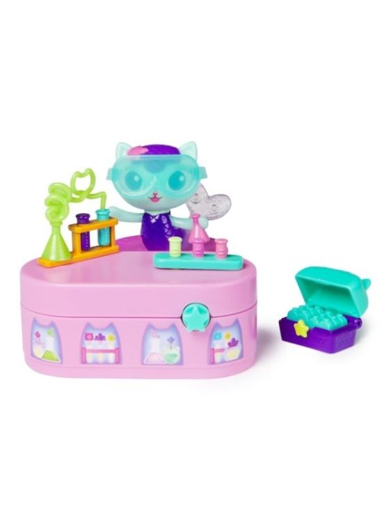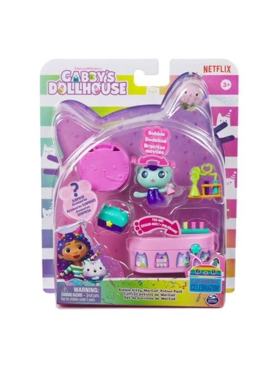 Fa echipa cu Pisirena pentru aventuri interesante in camera spa din casa de papusi. Pisirena este imbracata in tinuta ei caracteristica din casa de papusi a lui Gabby si vine cu micul ei raft cu tuburi de testare si cablul ei de pisica. Setul include, de asemenea, o masa de laborator cu o activare ascunsa, astfel incat puteti impinge steaua in jos pentru a face tuburile de testare sa se ridice si sa coboare pe tejghea. Apoi, la fel cum face Gabby in fiecare episod, despacheteaza o casa de papusi pentru a descoperi o jucarie surpriza - o pereche de ochelari de laborator pentru Pisirena. Toate jucariile din casa de papusi a lui Gabby sunt concepute pentru a se potrivi unele cu altele, astfel ca, pentru si mai multe moduri de joaca, cauta nava prietena Gabby Cat, casa de papusi perfecta a lui Gabby si camerele tematice din casa de papusi pentru a-ti construi si completa lumea casei de papusi (fiecare se vinde separat). Jucariile de plus din casa de papusi a lui Gabby, animalele de plus, papusile si accesoriile, personajele de jucarie si seturile de joaca sunt jucariile educative perfecte pentru fetele si baietii carora le place sa-si foloseasca imaginatia pentru a-si crea propria lume in casa de papusi. Pregateste-te pentru aventuri nesfarsite cu setul Bobble Kitty Pisirena Potion.