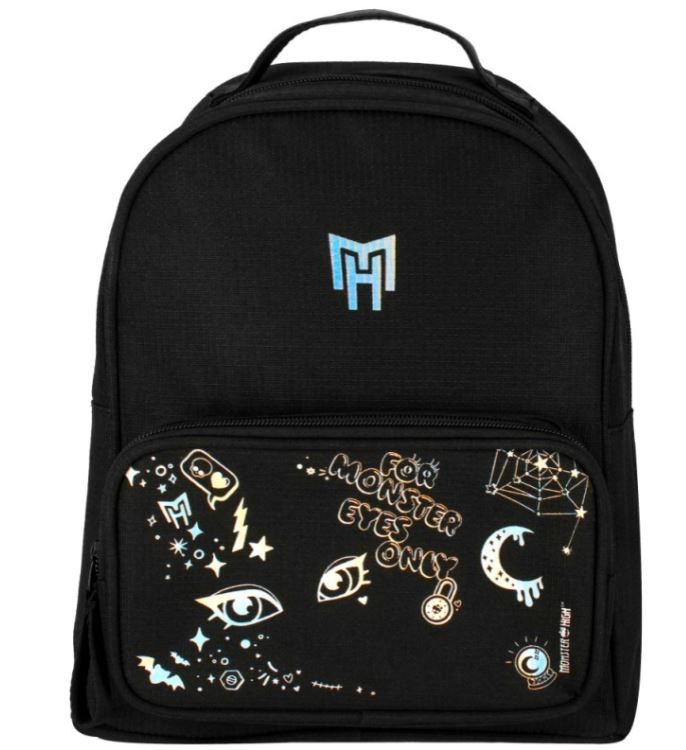Rucsac negru cu elemente grafice holografice pe față. În interior are o căptușeală cu logo-ul Monster High.