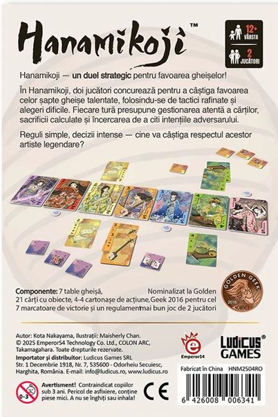 In Hanamikoji, doi jucatori concureaza pentru a castiga favorurile celor sapte maestre gheise, colectand obiectele la care acestea exceleaza.