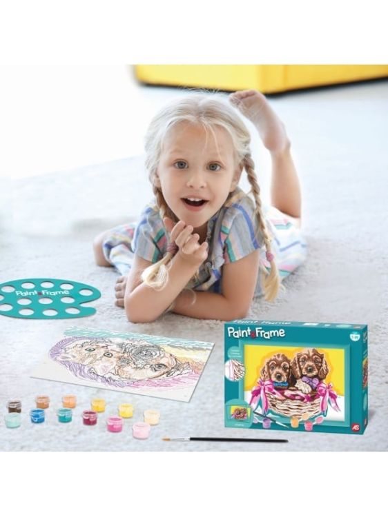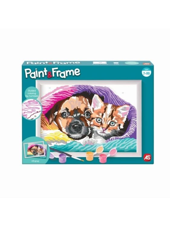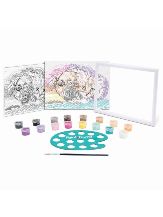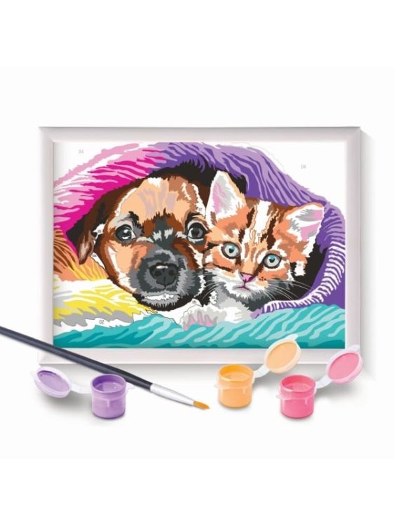 Setul include 1 cartonas preimprimat cu un design de caine si pisicuta, 16 vopsele acrilice in borcane de plastic, 1 rama din plastic, 1 pensula. Tema dulce prietenie. Copilul vede ce culoare corespunde fiecarei zone si o picteaza in consecinta. Rezultatul este foarte satisfacator, deoarece colorarea cartonului este ghidata.