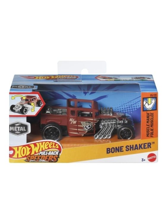 Aceste vehicule din metal Hot Wheels sunt la scara 143, cu decor autentic. Fiecare include o caracteristica interactiva precum Rolomatics, care evidentiaza miscarile motorului, sau usile, capotele sau portbagajul care se deschid. Cu detalii atat de grozave, posibilitatile de joaca sunt nesfarsite pentru copii, iar colectionarii le vor dori pe toate. Fiecare se vinde separat, in functie de disponibilitate. Culorile si decoratiunile pot varia. Acest pachet contine masinuta metalica Bone Shaker Muscle Mania.