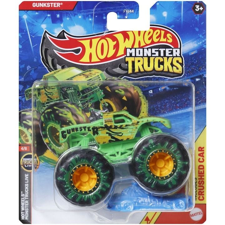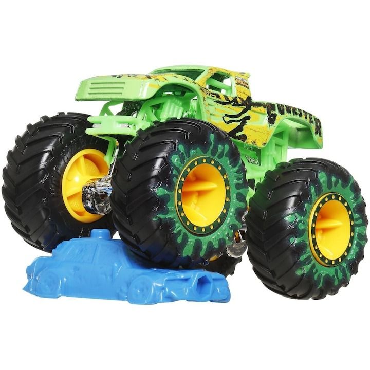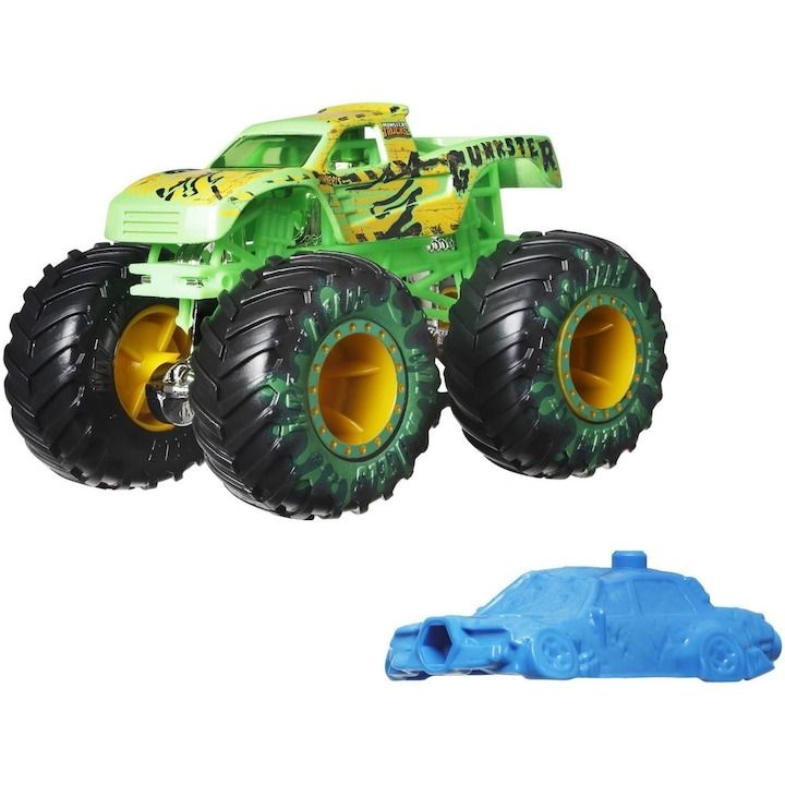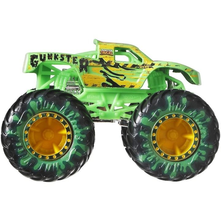 Colectioneaza masinutele Hot Wheeels gigantice pentru numeroase cascadorii. Striviti competitia cu masinuta de baza 164 are motoare puternice de frecare si actiuni feroce pe roti, acesti monstri sunt de neoprit. Fiecare se vinde separat, in functie de disponibilitate. Culorile si decoratiunile pot varia. Acest pachet contine personajul Gunkster.